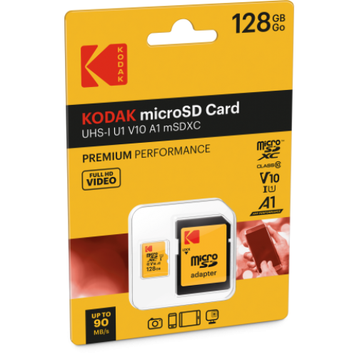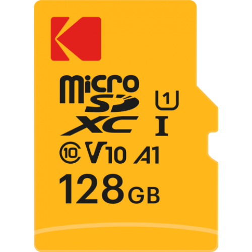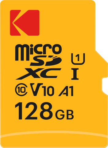 柯達 128GB microSDXC 卡提供高達 128 GB 的儲存容量。它符合 UHS 速度等級 1 (U1) 和視訊速度等級 10 (V10) 標準,
